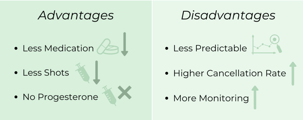 The physician will recommend nFET to patients who ovulate regularly and wish to use fewer medications for their transfers. The nFET cycle involves letting your body naturally develop a follicle, a trigger shot to induce ovulation, then estrogen and vaginal progesterone supplementation to help support the endometrial lining for a transfer.