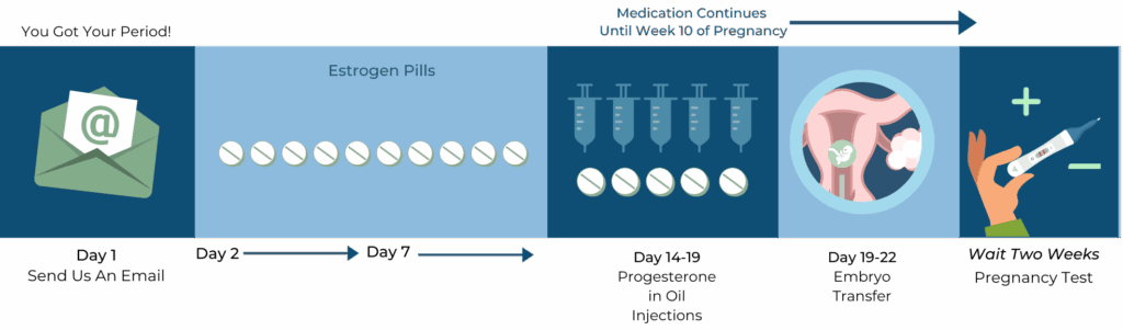 This cycle entails estrogen supplementation starting from Day 2 or 3, as well as intramuscular progesterone in oil (PIO) shots starting around Day 13 or 14 to time the transfer.